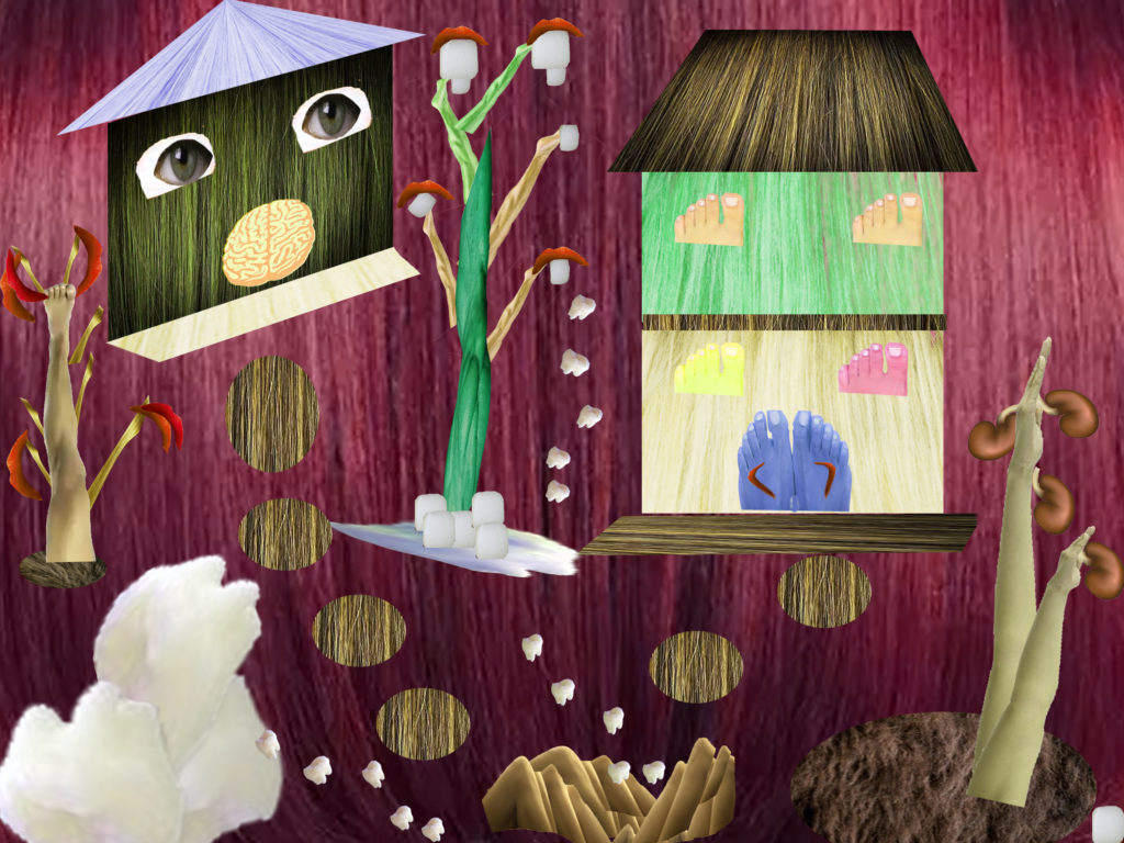 DESCRIPTION: This assignment involves creating landscapes using different parts of the body. I skewed and distorted some bits of the hair pieces by transforming them into different shapes. The first part is used for the house, then the other is used for the roof, and then the third piece is used for the background. The eyes and the feet represent the windows and the brain represents the door. The teeth reprsent the icicles falling from the tree which are the arms.