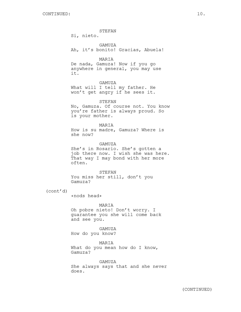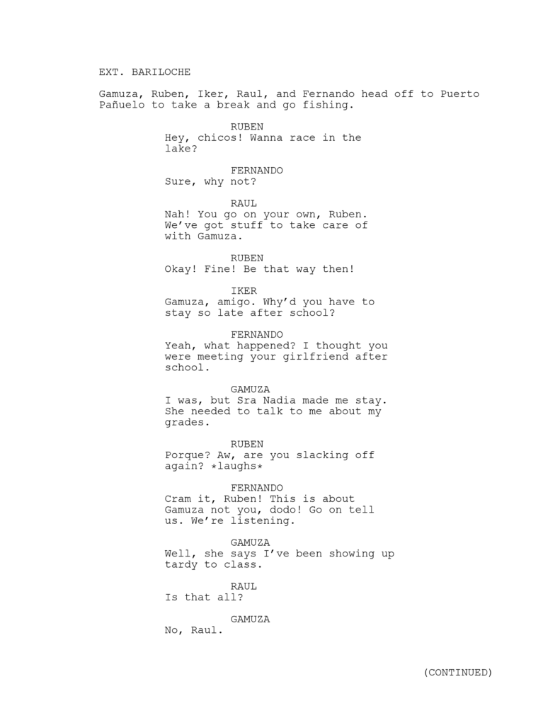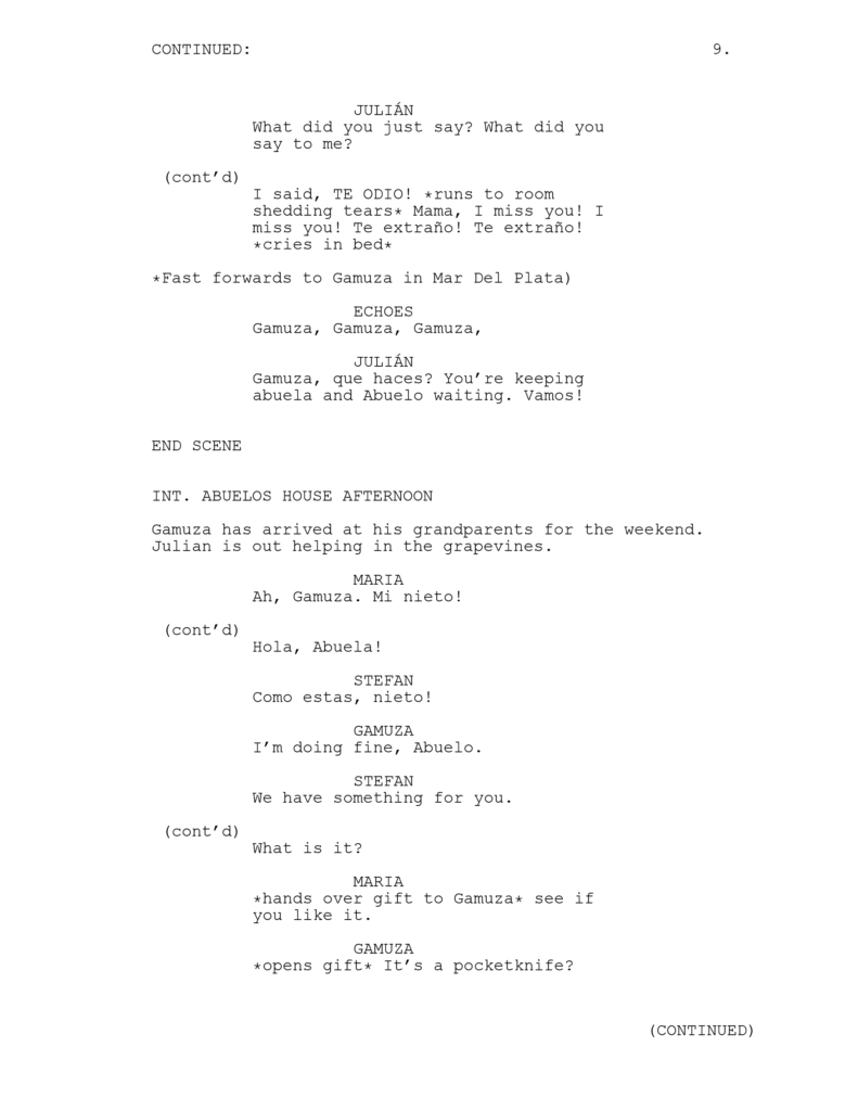 DESCRIPTION: In this script, I created a story about a boy named Gamuza Rodriguez who lives in Buenos Aires, Argentina and dreams of becoming a great football player however, everything changes when his abusive drug addict father threatens to chase Gamuza’s soccer dream away from him. The story ends with Gamuza winning the soccer championship and reuniting with his mother.