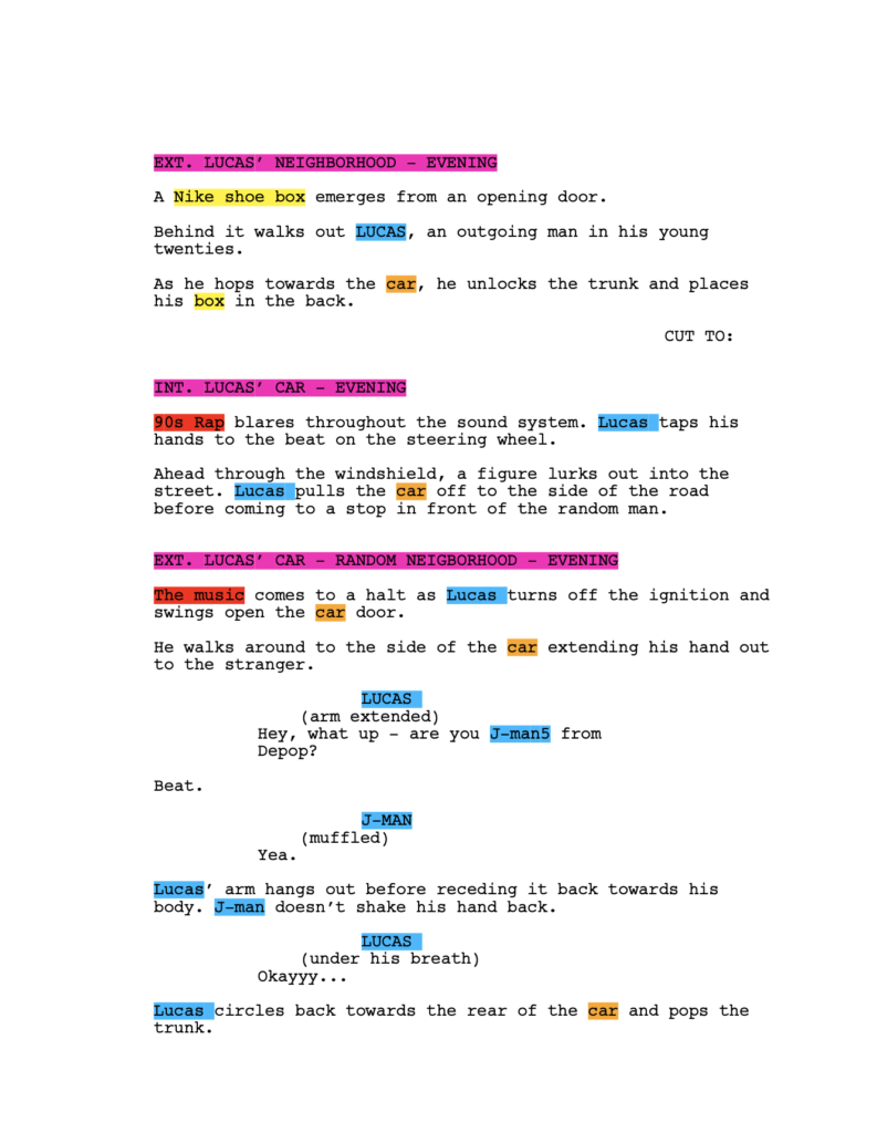 DESCRIPTION: Along with the script for my final film in FMX 341, we were also tasked with creating a script breakdown to help with the producing side of preproduction. This was the first time I had made a breakdown so it was a very effective way in helping visualize essential props, wardrobe, setting, and other various factors that would be essentials for my groups film. Having this version of the script was also super helpful on set – being able to look at the color coding made it very easy to organize ourselves on set.