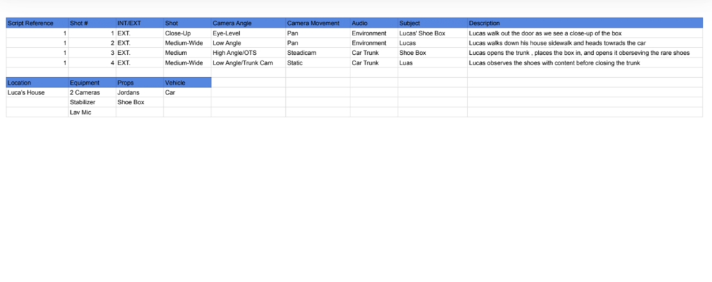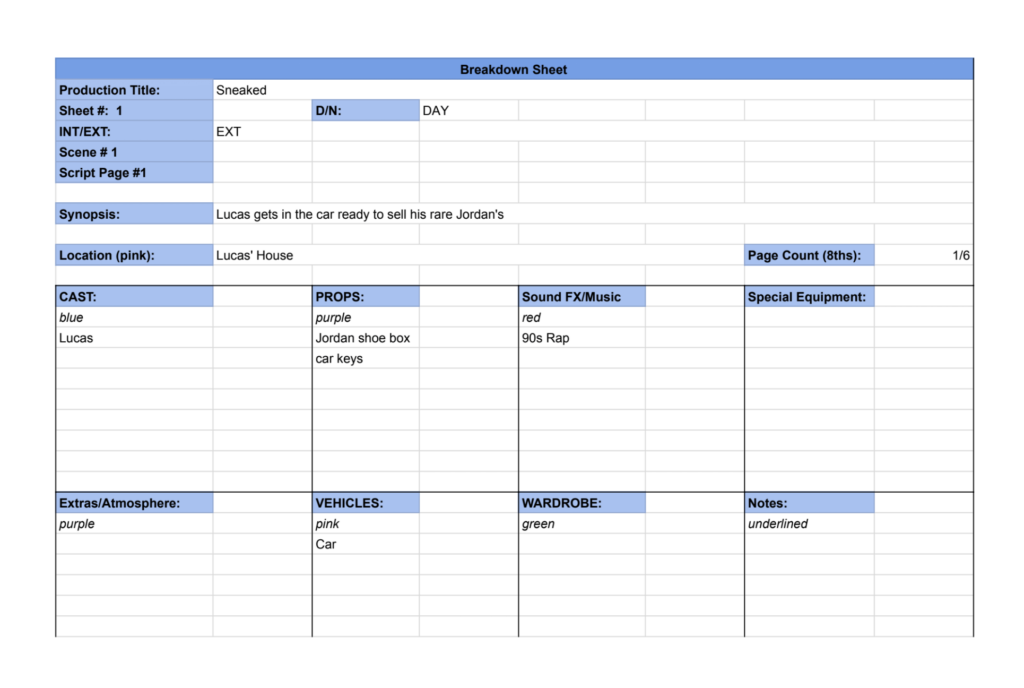 DESCRIPTION: This breakdown sheet was just one of the six sheets my group had laid out for our film. With corresponding color coding, it was easy to bounce between documents, but also keep a list of essential items for our film. It also was great with helping us plan out vehicles and locations that we would need to assemble as well.