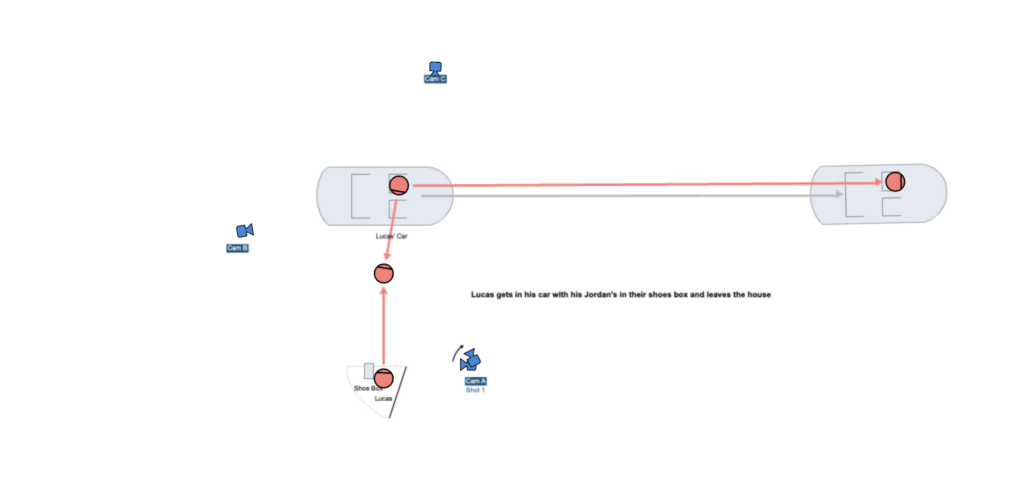 DESCRIPTION: This is just an overhead layout for just one of the scenes in my film Sneaked. By mapping out the camera setup and character movement through the environment, it helped create a clear instruction manual to follow once the days of shooting began.