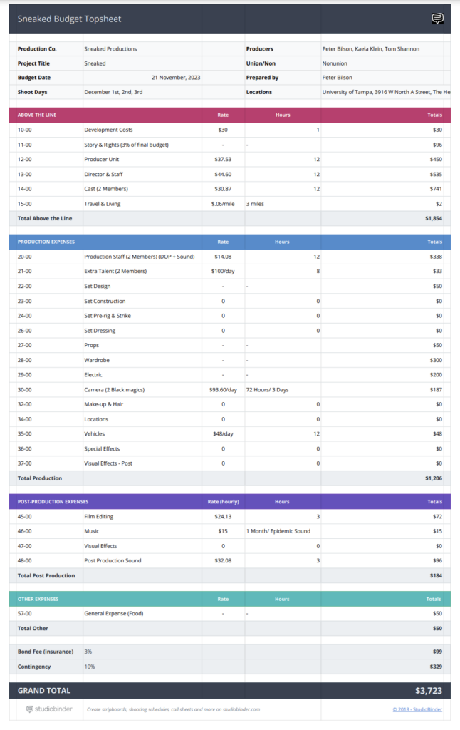 DESCRIPTION: Although the university gives us a lot of accommodations for our film shooting, creating a realistic budget is a great way to prepare for the real world of producing and what to expect when creating a short film. This budget sheet helped me envision the tasks I might undergo in the future, but also helped me realize how thankful I am for the equipment and shooting spaces the university offers us students.