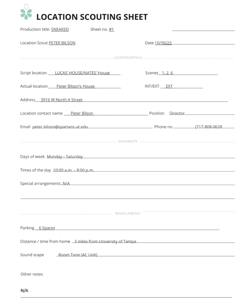 DESCRIPTION: Creating a scouting location was a an essential part of planning out my film, Sneaked. Not only does it help confirm where we shoot and what days we plan to, but it also allowed me time to envision each space as I was planning out the shot lists and other important factors that revolve around location.