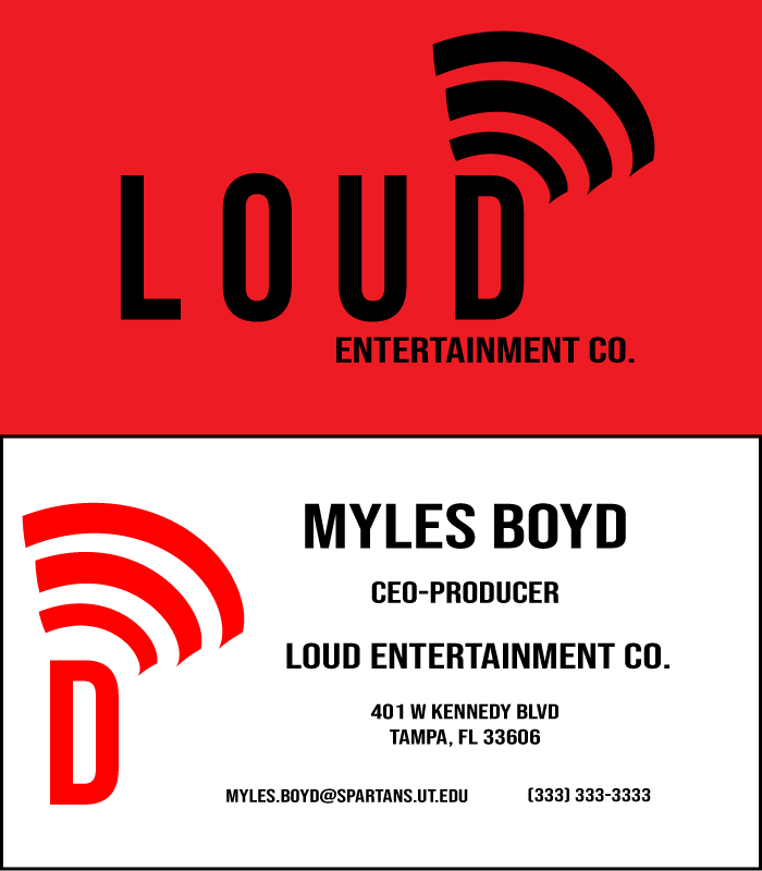 DESCRIPTION: For the logo and business card project we first had to do an exercise where we wrote 5 characteristics of ourselves. Then of those 5 words we had to design different potential logos on paper, and choose the best one. Out of my 5 words I chose to use the word “loud”. After brainstorming, I decided to make an entertainment company logo and have myself portray a music producer. This was not the original idea I had in mind where I first wanted to make a cheerleading bullhorn that spelled “LOUD” at the base of the horn. That idea was extremely complicated, so instead I went with my second idea which was sound waves like a speaker.