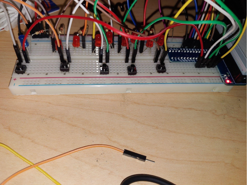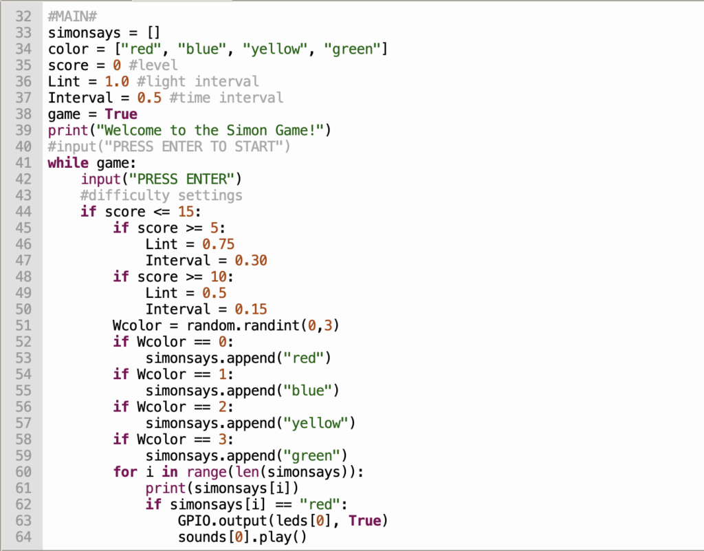 DESCRIPTION: “Simon” is a game that is based off the popular kids game Simon Says. The program is hooked up to the Raspberry Pi breadboard which is wired so the program will turn on a series of lights in which you must press buttons to repeat them. The game is equipped to get faster as you progress and complete the levels. I was also able to code sound into the game so each color emits its own noise when the program gives you the sequence and when the player presses the button.