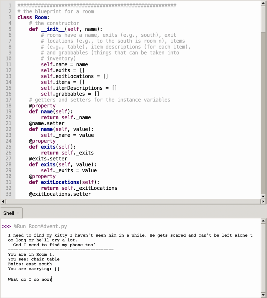 DESCRIPTION: The “Room Adventure” game is a text-based adventure done entirely in Python. The program offers different ways to enter rooms, find and collect objects, as well as meet the main objective of the game outlined in the beginning. All of this can be achieved by typing in different commands after “What do I do now?”. The game also includes a special room where there are no exits and you fail, incentivizing the player to make the right choices.