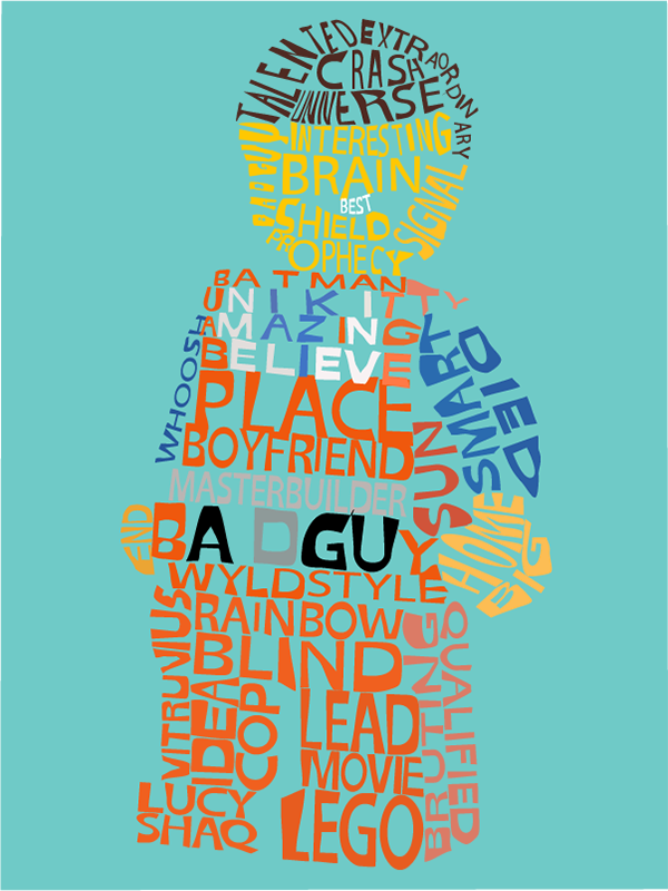 DESCRIPTION: In this project we were asked to create a character made out of typography. The character I chose to go with is “Emmet” from “The Lego Movie”. I was able to use to an image of him as a reference and all of the words he is made out of is a culmination of different character names, character traits, or quotes throughout the film. The hardest part of this project was bending the deforming the words the proper to get the get the right shape but also make sure it doesn’t look too messy since all the words are very close together.