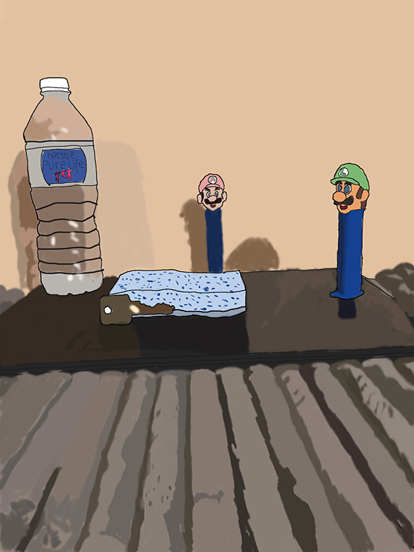 DESCRIPTION: For this still life portrait, I took different objects from my room and put them all together to create a new image as a reference. I then used that to re-draw all the objects by connecting a WACOM tablet and for someone who isn’t good at drawing, I liked the way this tuned out. The hardest part was making the shadows look real and always giving the plastic water bottle that clear color. The objects you see displayed include two Super Mario Bros PEZ Sticks, A laptop, plastic water bottle, blanket, key, and a sponge.