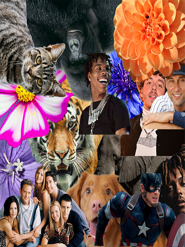 DESCRIPTION: The task for this was to take a bunch of different images and smash them all together to create a collage. My idea for the images was to take a bunch of different things I like from different topics and combine all together. Some of these images you see include my favorite characters from movies, favorite music artists, role models, animals and other objects.