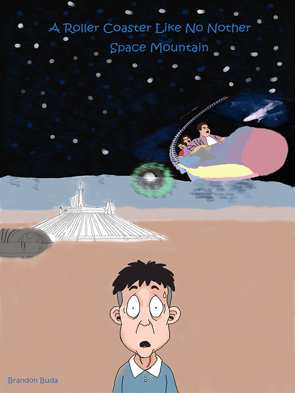 DESCRIPTION: For this project I wanted to create a fake advertisement for my favorite roller coaster located at Florida’s Magic Kingdom, which is “Space Mountain”. I thought a cool idea for this would be to make the scene be set in space have the roller coaster fly through to really give it those space vibes. I then used the actual ride as a reference to draw the exterior part of the ride. I also used a cartoon character as the reference for the scared person to add a bit of that nervousness feeling to the ride.