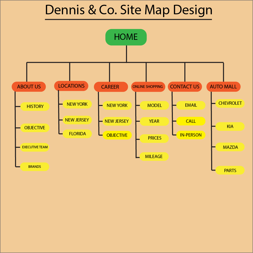 DESCRIPTION: This was the site map I created for website we were going to make. For my website, I interviewed my dad since he is the Vice President of Construction and Real Estate Development at Dennis & Co and thought I could a lot of good information from this, and I did. I then looked at the actual website of Dennis & Co and started to form some ideas of how I could map this out. This was fairly easy to make, but it was very helpful when it came time to creating the actual website.