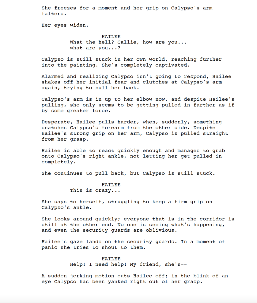 DESCRIPTION: This was officially the first script I had ever written! I was so excited to come up with a wild idea to put on a page, and that’s exactly what I did. Prior to this, I was way more used to writing in a novel format, so I had to get used to the change in style…and ultimately decided that I was way more into the script format than writing a story the usual way. Zelladonia follows Calypso Kalia, an art student who has always had appreciation for art museums and everything in them. While visiting the Louvre with her best friend Hailee, Calypso becomes vexed by one particular painting and ends up getting pulled into it and into another world. Hailee, on the other hand, can’t get pulled in with her as she’s not originally from that world. Calypso is. This alternate world is called Zelladonia and is where the title of the script gets its name. Zelladonia is a world that has been devastated by a powerful and evil lord, and the only one who can stop him is a sorceress (Calypso) who’s power surpasses that of the lord’s. Calypso has absolutely no idea of her history and her destiny, and she only has a matter of time to fulfill her role before the evil lord discovers a way to strip her power and take it for himself.