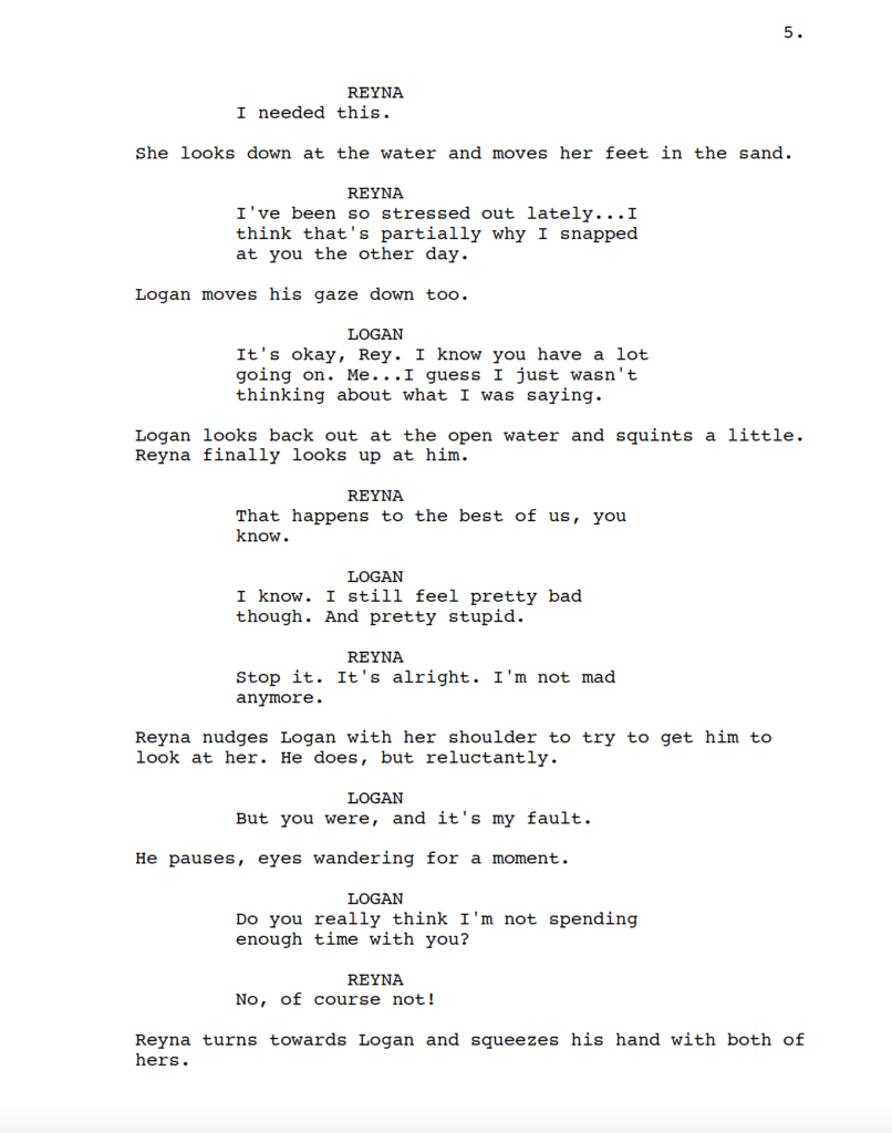 DESCRIPTION: The script for my narrative final in narrative production. As stated previously under the “Narrative” tab, the short follows a couple that has just fought. Neither of them have talked to each other in a few days, but they realize that they were both in the wrong and reach out to talk through it. The story was inspired by my own long-distance relationship as my boyfriend and I have certainly had our share of fights but always manage to work things out because we understand that communication is key. The original reunion was set to be a beach scene, but because of what ended up happening with my actors and the set in general, plans changed and we used Plant Park instead.