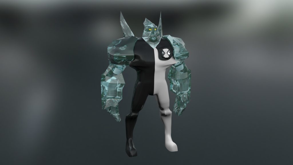 DESCRIPTION: This is a rendered image of my final project, where I recreated Diamond Head from the show Ben 10. Using reference images from Google, I 3D modeled the character and applied custom textures to give the crystal parts a translucent, diamond-like appearance.