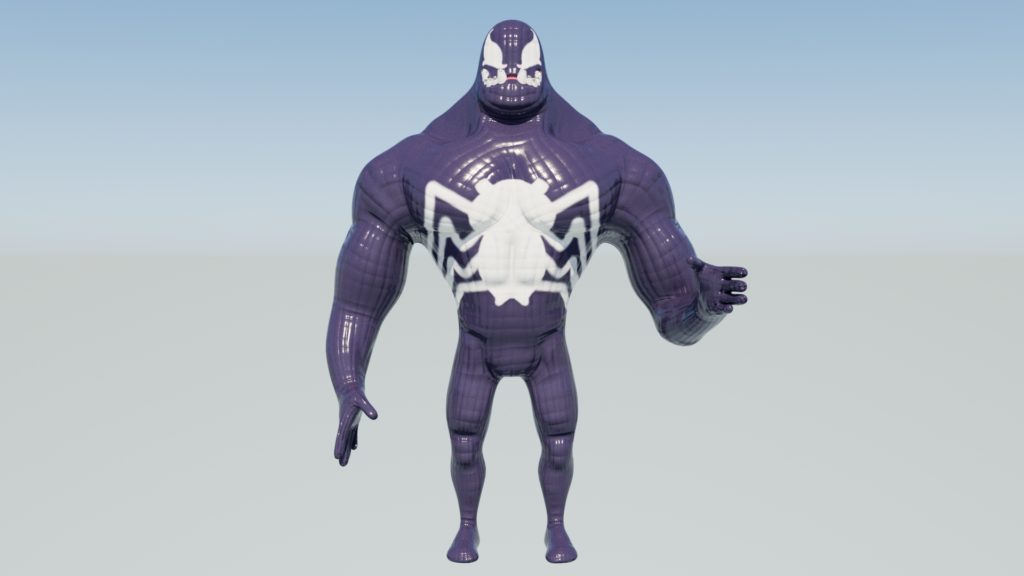DESCRIPTION: This is a rendered image of Venom, featuring a skydome background to create atmospheric lighting. I applied specific lighting and texturing techniques to achieve a glossy, reflective surface that enhances the character’s menacing appearance.