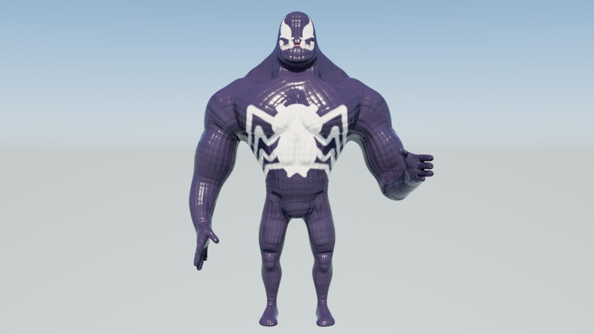 DESCRIPTION: This is a rendered image of Venom, featuring a skydome background to create atmospheric lighting. I applied specific lighting and texturing techniques to achieve a glossy, reflective surface that enhances the character’s menacing appearance.