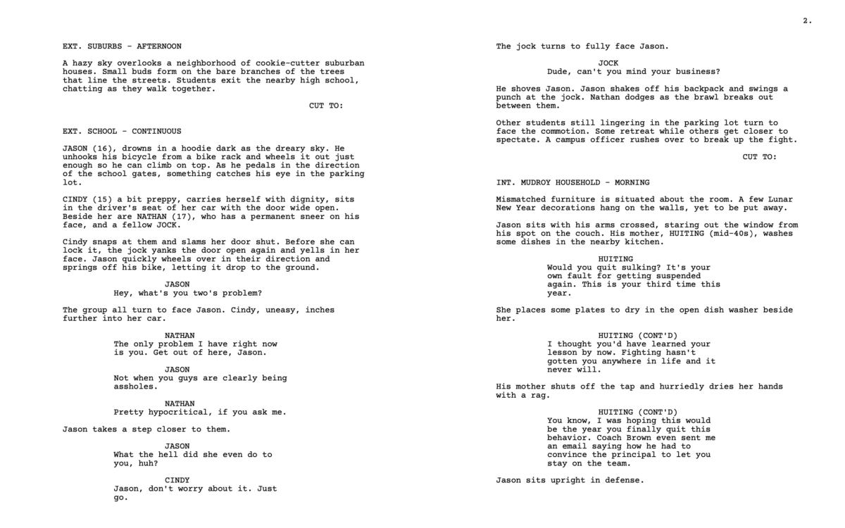 DESCRIPTION: Sixteen-year-old Jason Mudroy lives in a small town in Georgia with his single immigrant mother. Jason is hotheaded and known for getting into fights both in and out of school. After being suspended yet again, he returns days later and finds a new boy by the name of Cameron in his seat in first-period psychology. The two are paired up for a group project and thus begin to get to know one another better. While Cameron finds himself falling for Jason, the latter instead finds himself drawn toward the newcomer’s enviously stable family life.