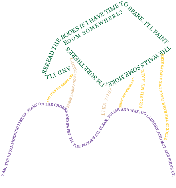 DESCRIPTION: For the calligram assignment, we were tasked with recreating an image using calligraphy. I chose to use song lyrics as my text, that being a few lines from the song “When Will My Life Begin?” from the film Tangled (2010). The lyrics recount Rapunzel’s disatisfaction with her monotonous life and she lists off her daily tasks, one of which includes reading books. With this in mind, I chose to model my calligram off a stock image of a woman with a book on her face and colored the text in a similar color palette comparable to that of Rapunzel herself.