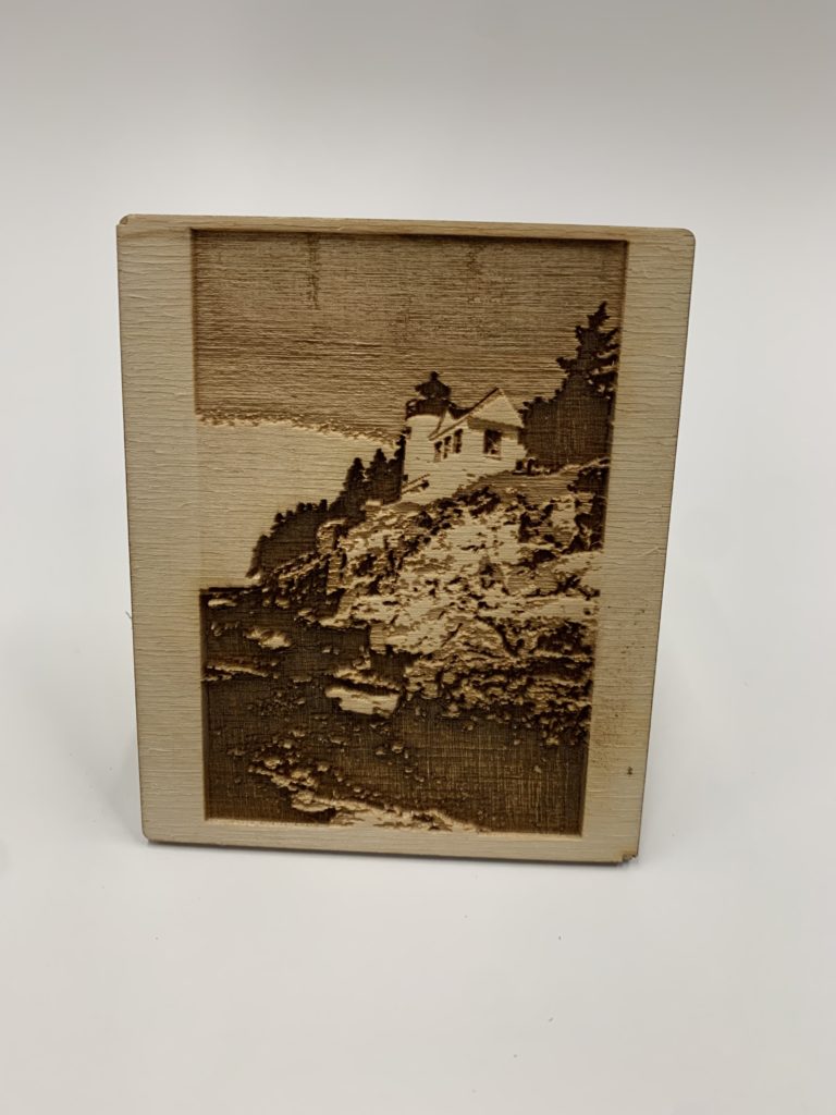 DESCRIPTION: An engraved photo of the Bass Harbor Lighthouse in Mount Desert Island. I separated the lights and darks of the photo into three different layers in photoshop and set each one at a different speed and power to create a sense of depth and shading in the wood.