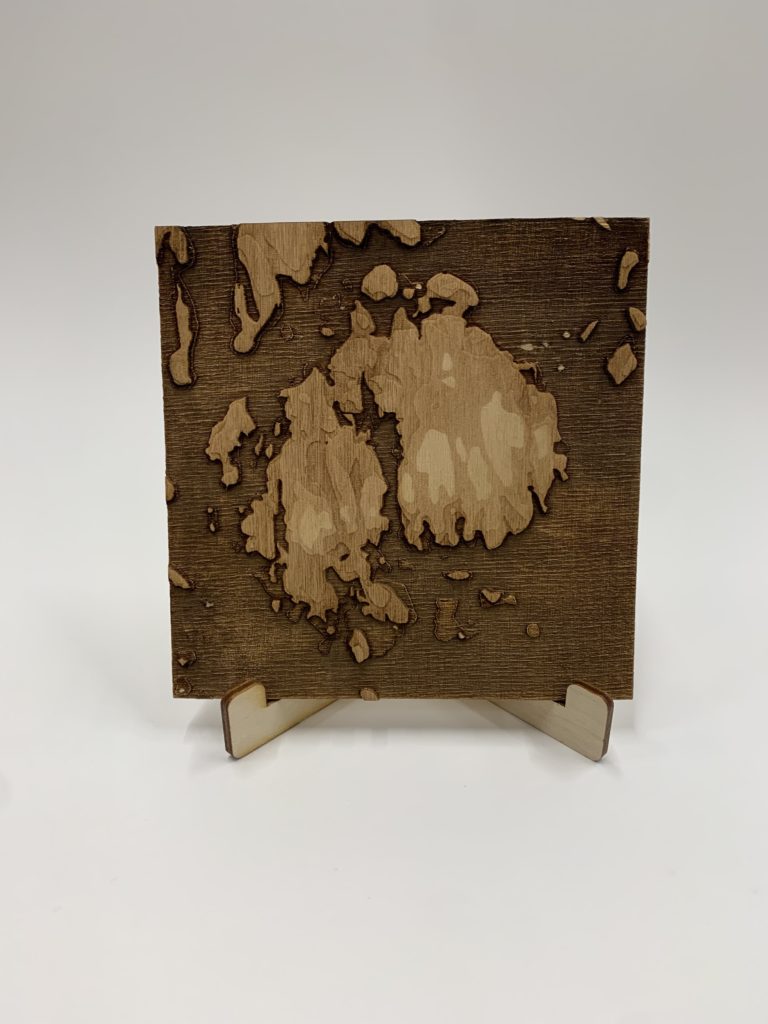 DESCRIPTION: A topographical map of Mount Desert Island with each elevation being cut at a different power to create depth.