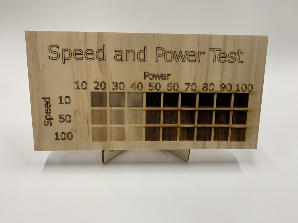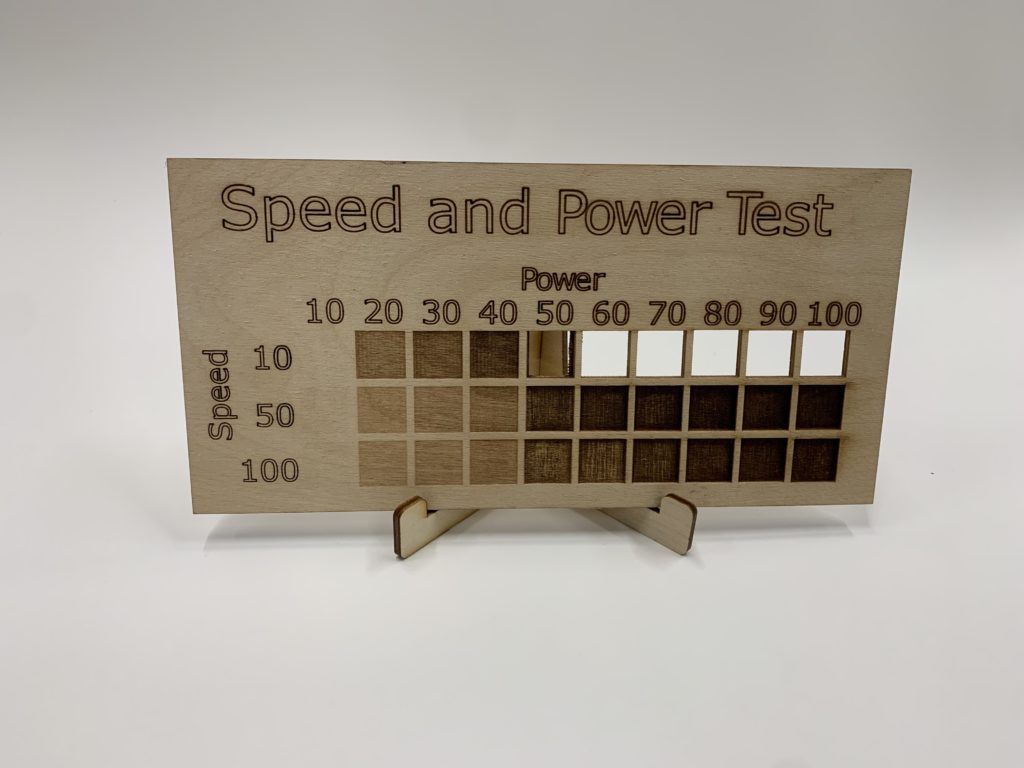 DESCRIPTION: A speed and power test performed on 1/8th and 1/2 birch plywood to show as a reference for engraving at the FabLab. Each box was individually placed and calibrated to the specific speed and power of our laser.