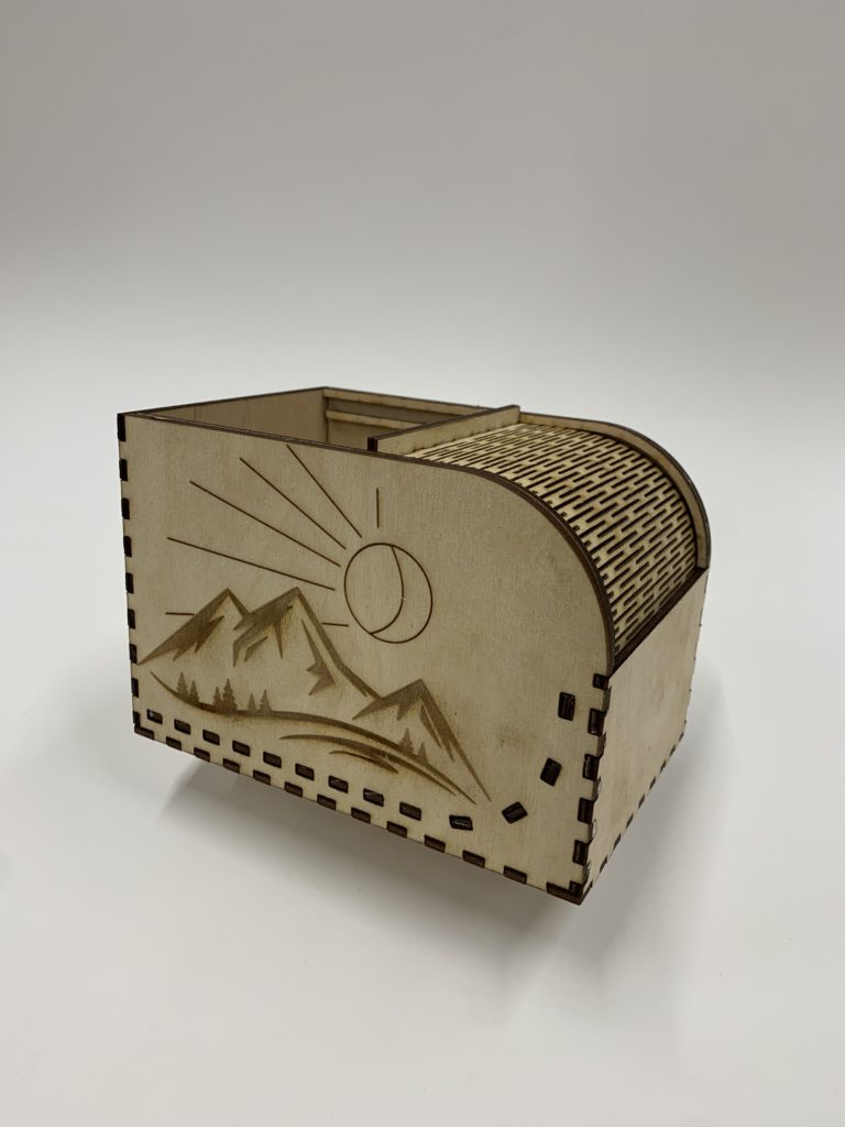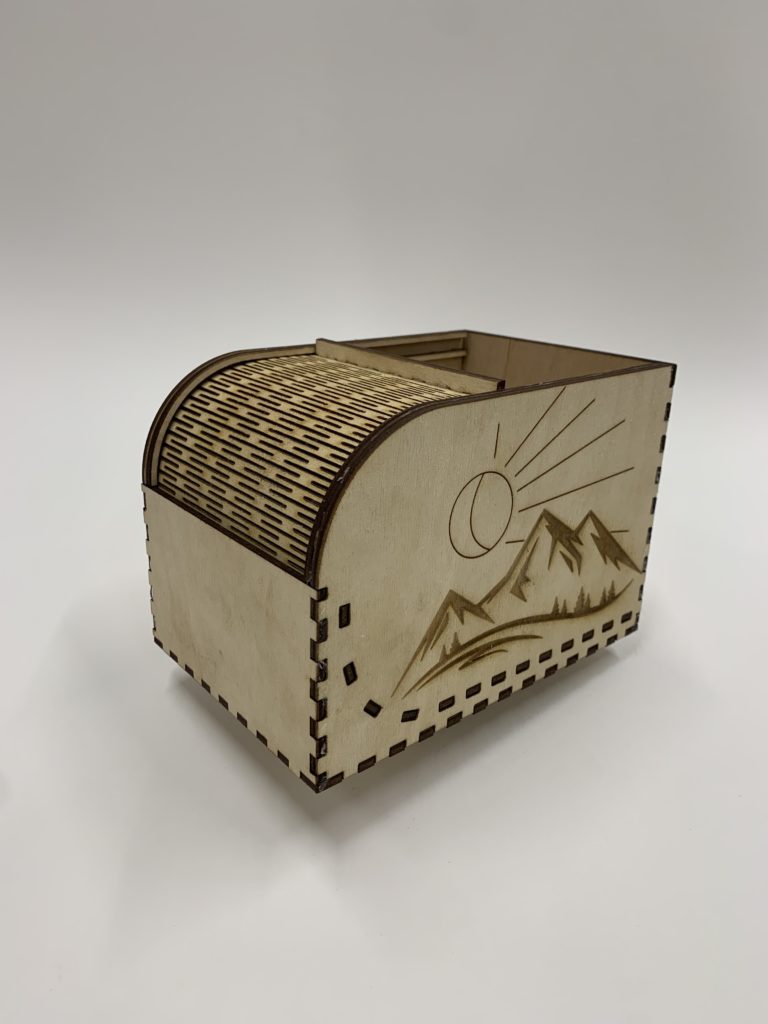 DESCRIPTION: This was one of the first complex boxes I made. I designed the dimensions of the box on boxes on boxes.py and designed the engravings in illustrator. The door slides and bends into a hidden compartment on the bottom, similar to a bread box.