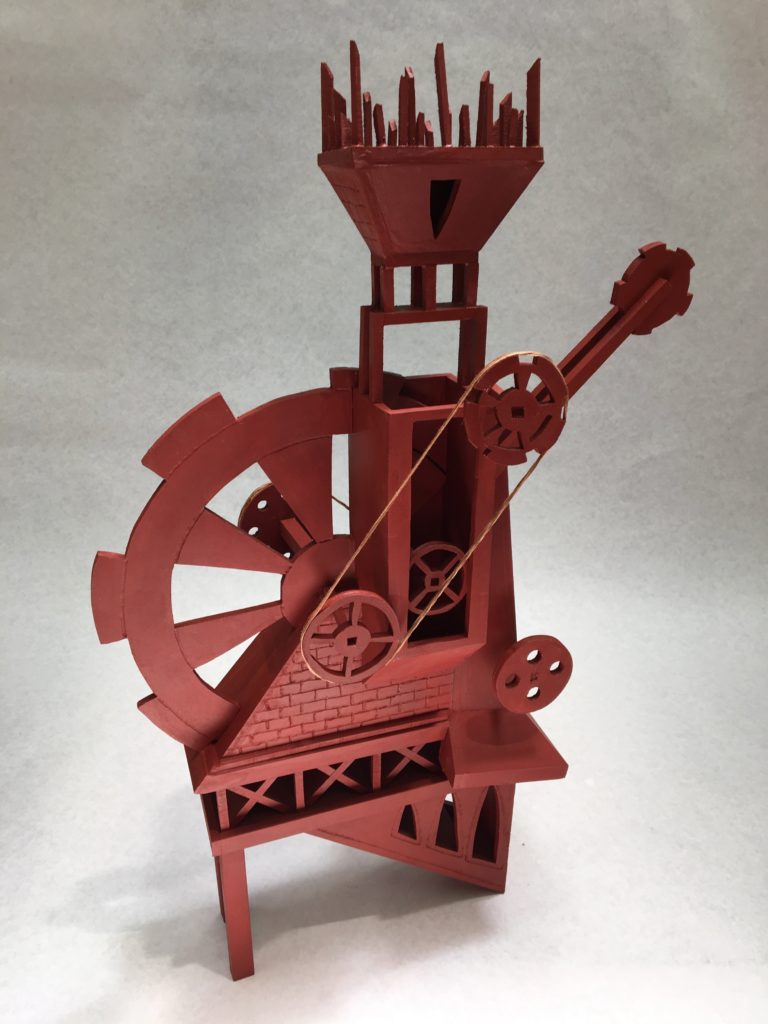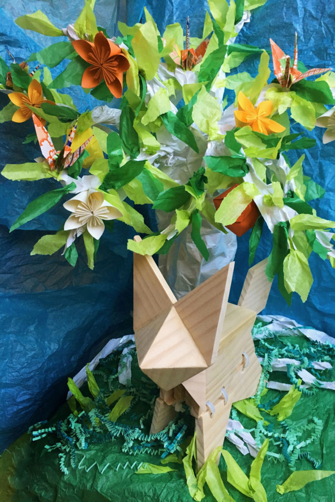 MEDIA: 3/4″ x 1-1/2″ wood plank, origami paper, tissue paper