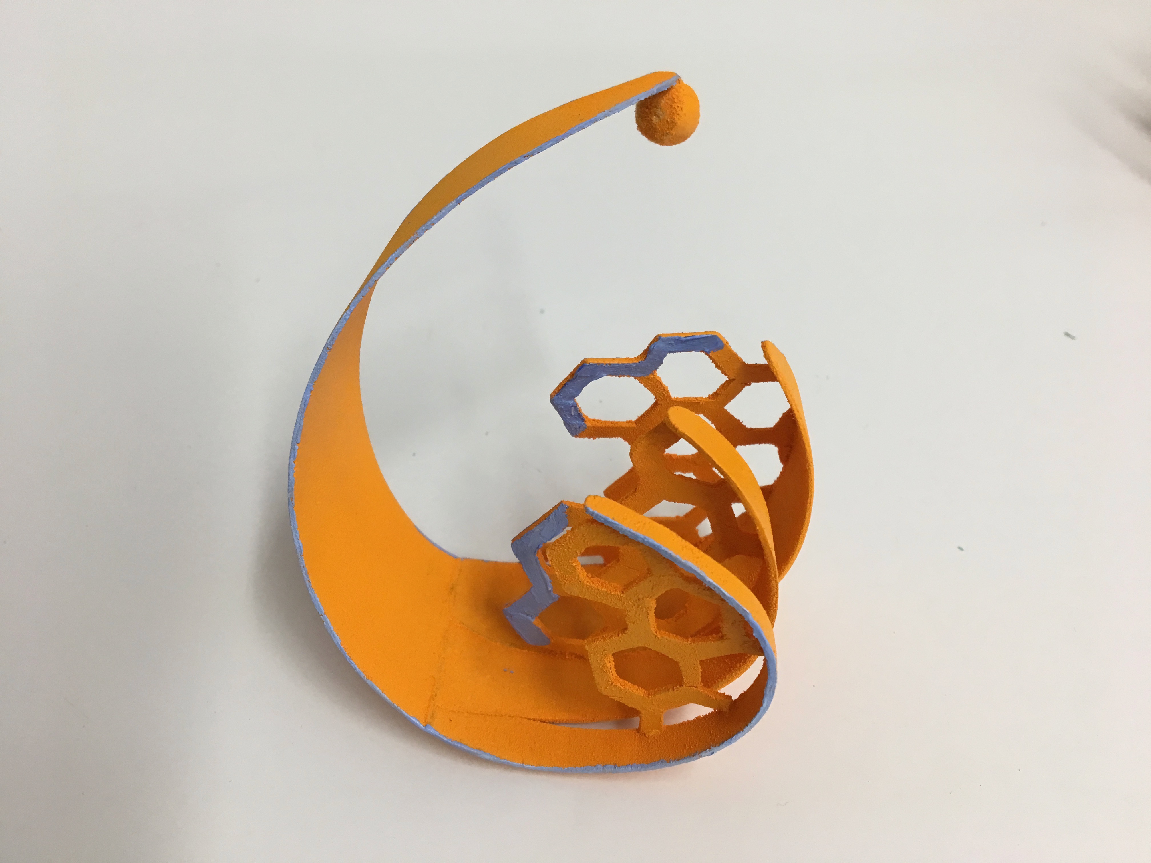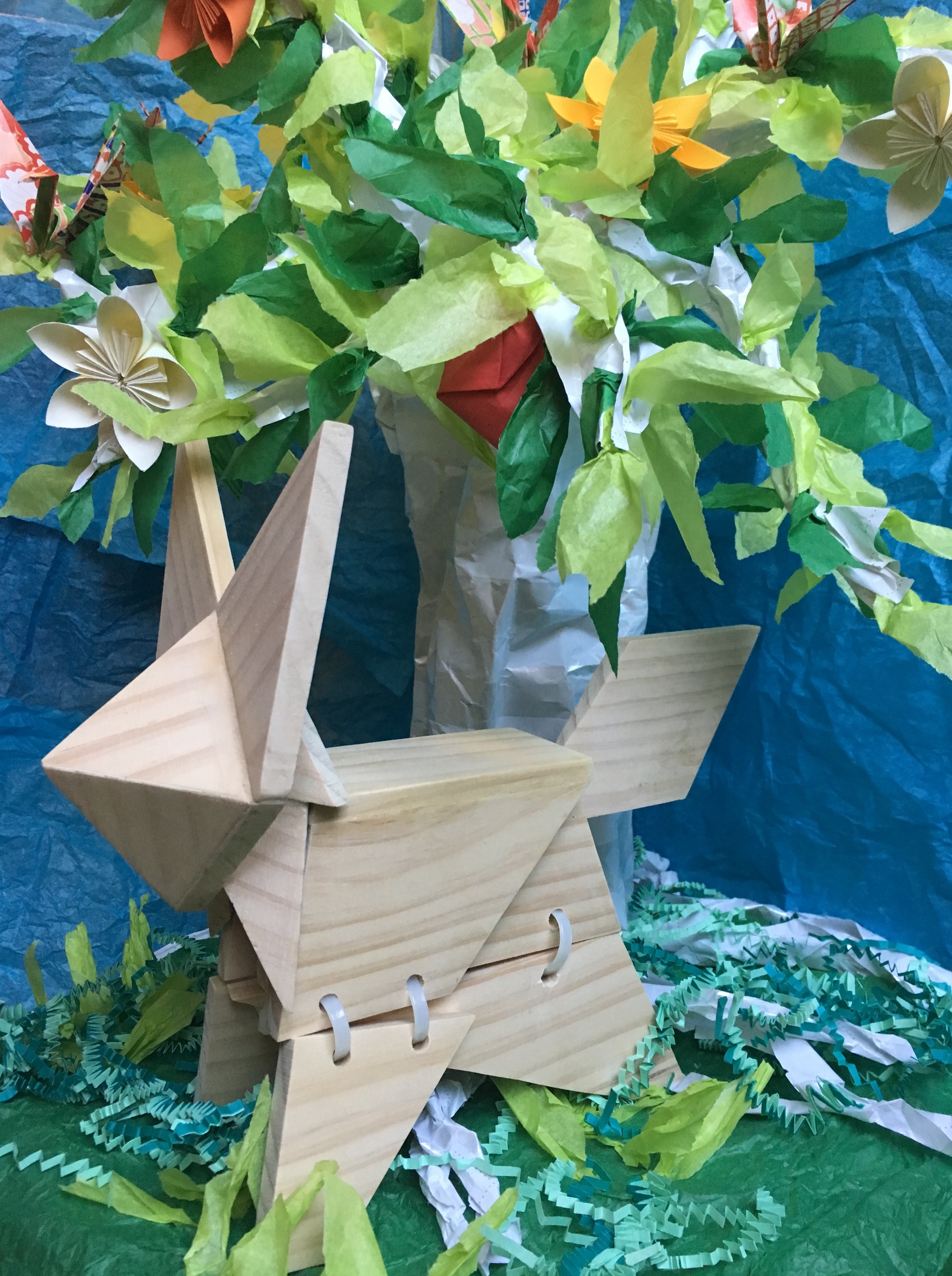 MEDIA: 3/4″ x 1-1/2″ wood plank, origami paper, tissue paper