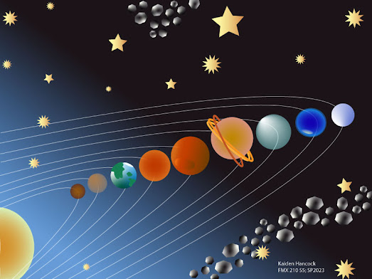 DESCRIPTION: This solar system creation was part of an assignment to learn how to manipulate polygons as well as gradients within Illustrator. The asteroid belt took a lot longer than I thought it would, but I think that it added the right amount of detail that the piece was missing without it. Creating all of the planets in detail in different layers allowed me to learn how to manipulate different assets in Illustrator better. I really had fun creating this piece.