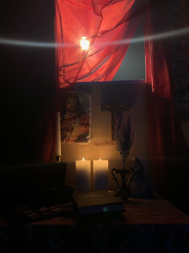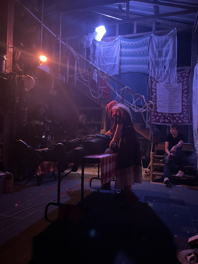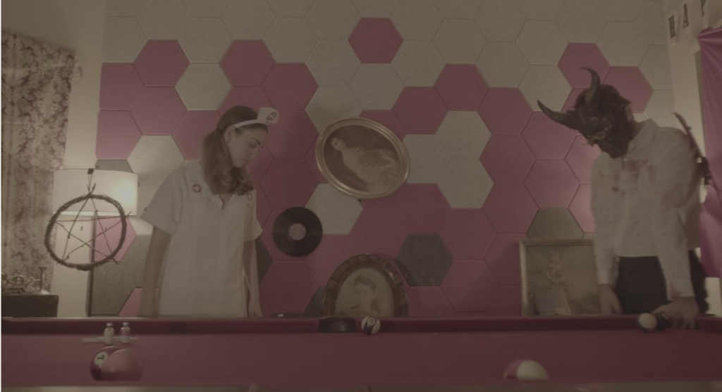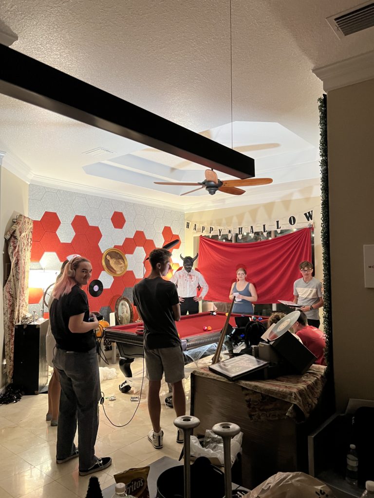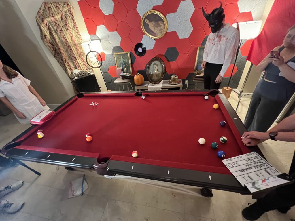 DESCRIPTION: This project was definitely a strange one. It was an assignment for the course ‘The Creative Triangle’, and the assignment required our group to incorporate two modifiers into Harlan’s death scene from Knives Out: “pool” and “your hometown’s local cryptid”. We filmed this piece the week of Halloween, so naturally, we went all out with the cryptid decor and I had a lot of fun with the production design of this. The stills shown are from the raw and uncolored rough cut.