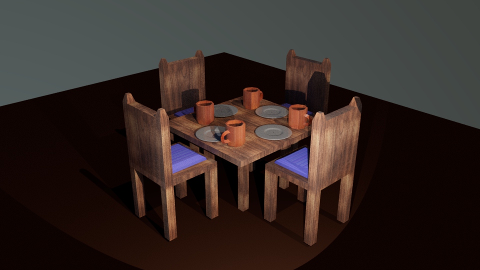 DESCRIPTION: For this scene, I created four models to make it look like a dinner table. In addition, I had to apply textures to each of the models. I decide to add plates and mugs on the table to help add detail to the scene. In Autodesk Maya, I started to design the center piece of the table. Then, I used the tools to sculpt the chair and the pillow before duplicating the model four times. I repeated the process for the rest of the models.