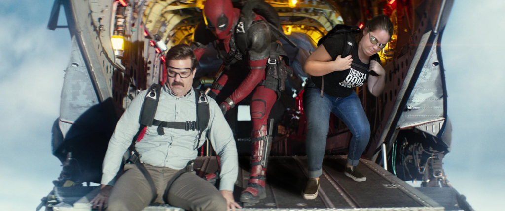 DESCRIPTION: I decide I want to put myself into Deadpool 2. However, the best scene i figured that I could be in is the helicopter scene. After taking a photo of myself with my backpack and some swim goggles, I was able to edit myself in Photoshop right next to Deadpool. I had to go into the photo and add some shading and lighting to make it look like I was about to jump.