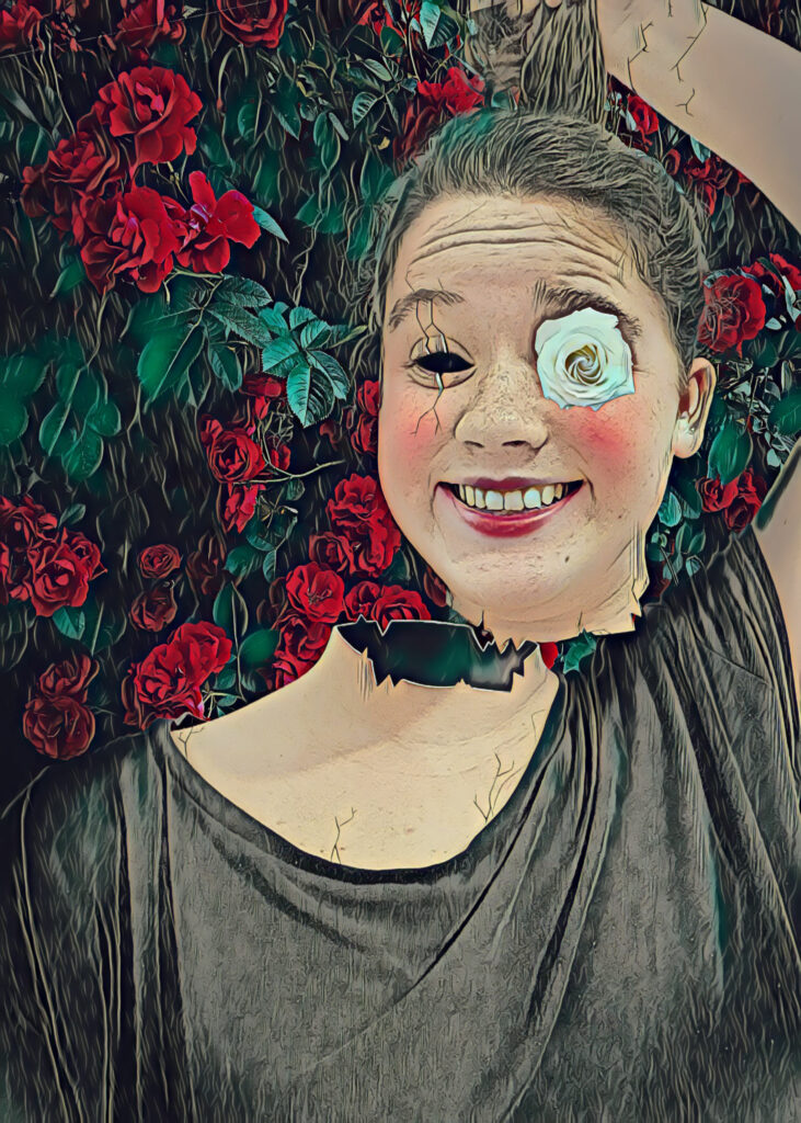 DESCRIPTION: This is an Autoscopy Photoshop Portrait. Before editing the photo, I had to take a picture of myself holding my hair above my head. After I was able to obtain the perfect photo, I went into photoshop the cut off my head and move it above my body. Next, I used the paint brush to add the broken porcelain style details. Finally, I added the background and used a filter to finish the final details.