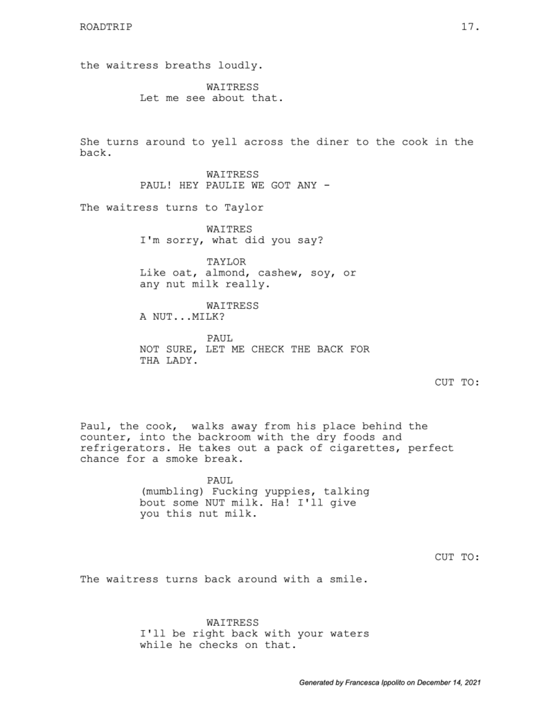 LINK: https://www.dropbox.com/scl/fi/601wbimqd3n5qluj0chs1/Francesca_ROADTRIP_FinalDraft.pdf?rlkey=l8518b8m45qw8cg5kwcfnkwi2&dl=0