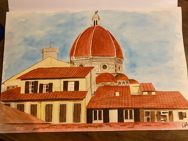 DESCRIPTION: This watercolor image of the city in Florence was one of my first watercolor paintings in the class. I chose to focus on the tiles of the houses because they blended so well with the color of the top of the Duomo di Firenze in Florence, Italy.