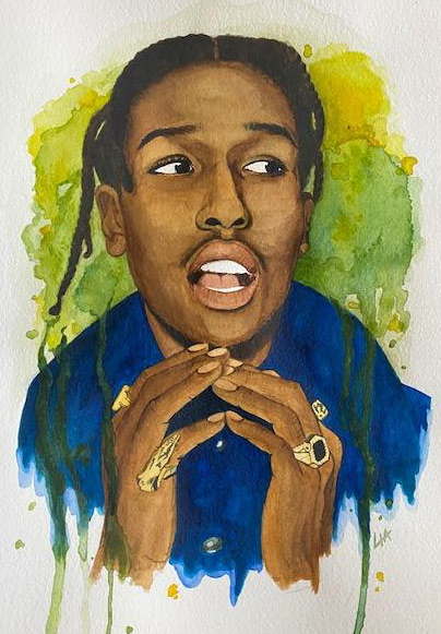 DESCRIPTION: I created this painting of the rapper, A$AP Rocky with watercolor on watercolor paper. I wanted to include bright, vibrant colors to contrast between the foreground and background. I used a photo reference for A$AP, but incorporated my own colors and the concept for the background.