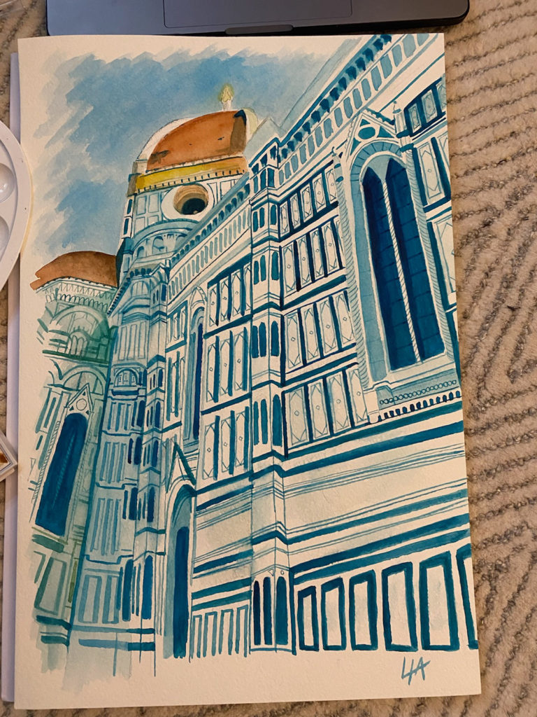 DESCRIPTION: This watercolor image of the city in Florence was one of my first watercolor paintings in the class. Similar to the above image, this is focused on the Duomo di Firenze, but more on the details of the building rather than the city scape, using cooler tones and straight lines to portray the complexity of the historic building.