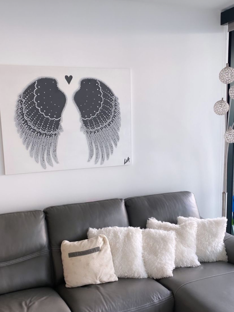 DESCRIPTION: This piece was created for my friend, Jordan’s, living room. It is representative of a little girl she was very close with who passed away with cancer. They met each other through Jordan’s non-profit cancer foundation, Whip Pediatric Cancer.