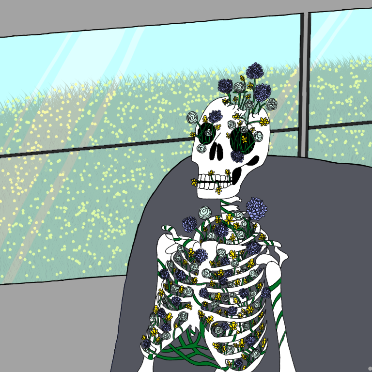 DESCRIPTION: This is a design for an album covered based off a song they had created. I sketched out the a skeleton on paper then retraced it in Ibispaint. I then added in all of the flowers and vines around them. I then added in the color and background.