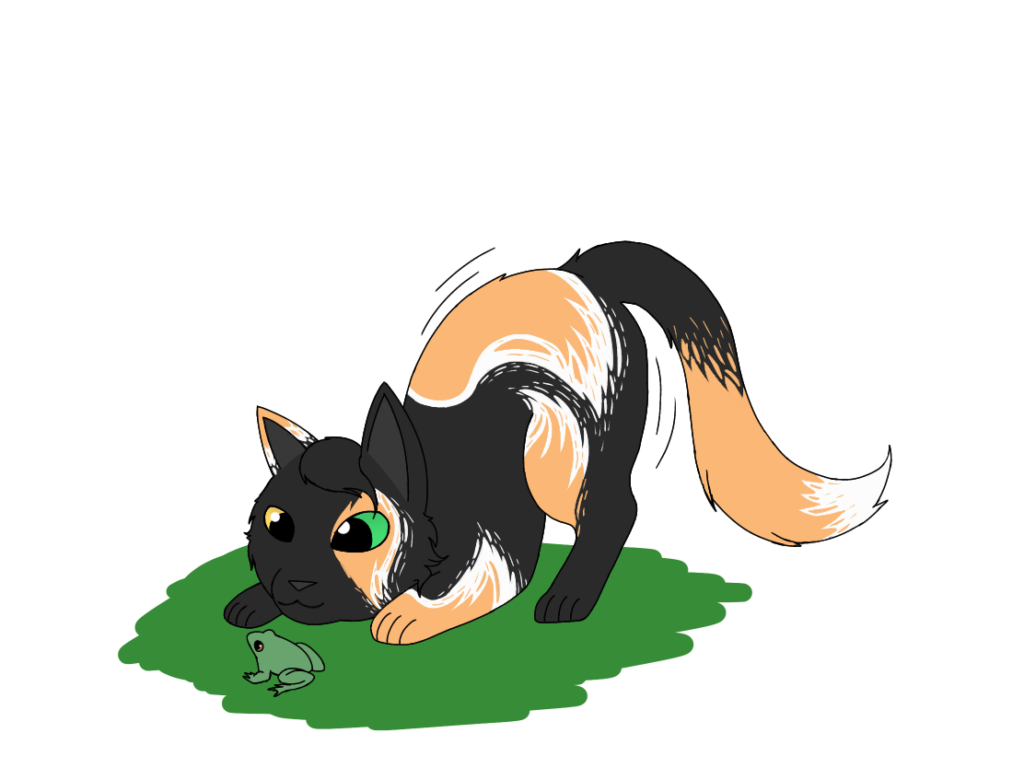 DESCRIPTION: This is a drawing of one of my friends ocs they had me draw. I found a refcne pictre of a cat crouched downlooking at something and drew the outline based on that. Then I did the line art and began to work on the design. The said the cat was black, apricot, and white but did not have a design for the markings so I created a design where the apricots and white patches swirled together. I then added a frog for them to be looking at and patch of grass, making the rest of the image transparent.