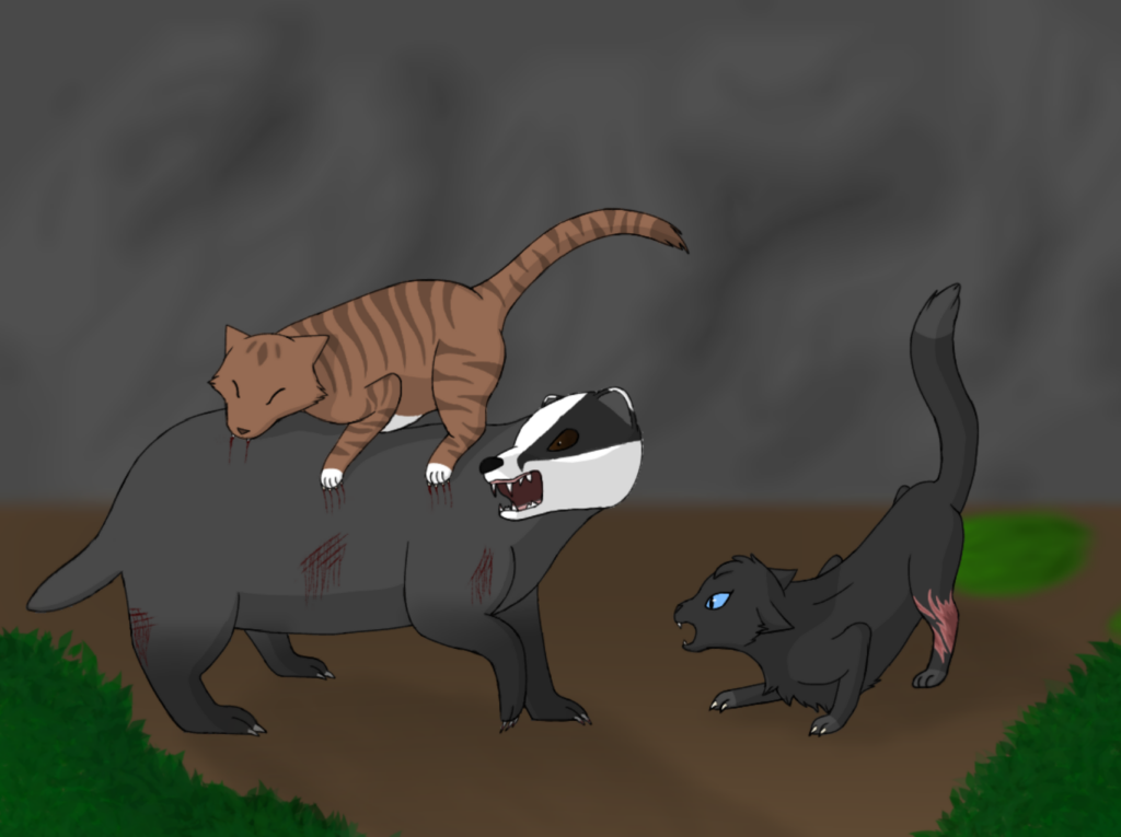 DESCRIPTION: I started with the badger, finding some reference images for one and making the outline. I then based the size of the cats off the bager and did their lineart. I then worked on coloring the badger and cats on a few diffrent layes. I then added in the background and shading. Then added in the last of the details to the image.