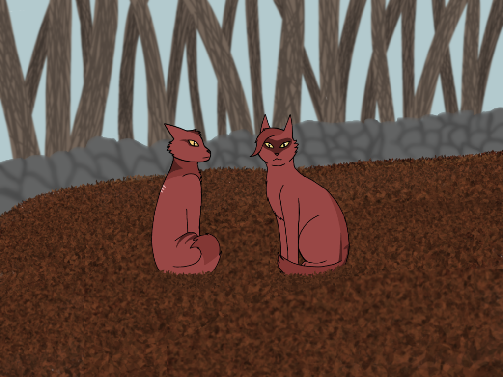 DESCRIPTION: I created the outline for the two cats based on refences iamges of cats sitting I had. I then did there line art and began to work on there design. They are brother and sister so I wanted them to have the same color skeme and simalr designs to them. I also wanted to use deep red colors due to their names and personalities. Once I finished coloring them I created the background, creating the clearing of dead leaves where they where first found in the story they are from.