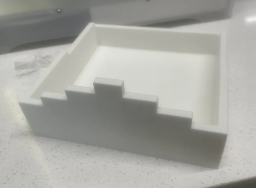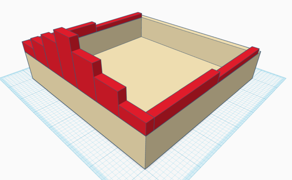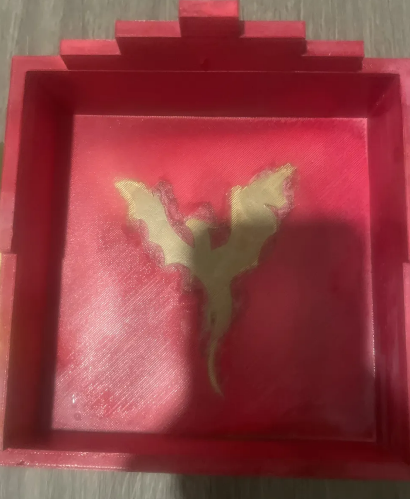 DESCRIPTION: I first created a design for a dice tray in Tinkercad by ajusting the size of cubes and placing them together. I then exported it and placed it into superslicer, making sure it would be a good size. I then put it into the ed printer and watched it t make sure it was printing propertly for a while. Once the print was finished I removed it. I then created a stencil of a dragon and worked on spray painting the dice tray, useing the stench to add in the golden dragon.