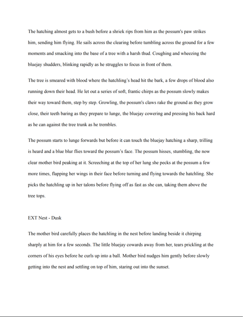 DESCRIPTION: I thought it would be cool to make a script about a hatchling who longs to fly despite beign to young too. I also wanted the charter to act like realistic aniamal as I did not include any diologue, only described the actions and environment in the script. Then started comign up with more ideas for the script eand created an outline for myself. Then I wrote out the full script based on the outline and adding in many more details as I went along.
