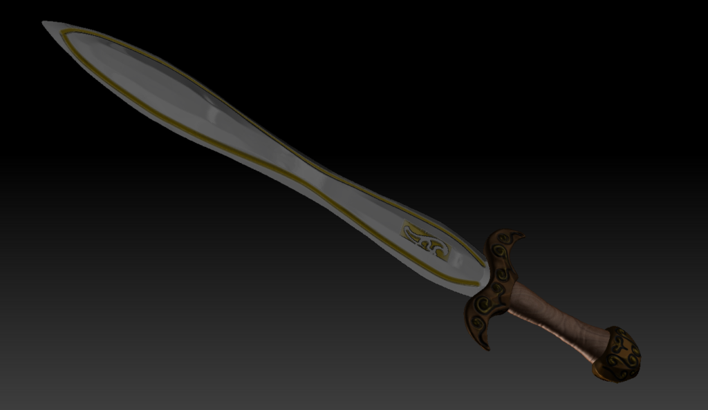 DESCRIPTION: A word with a golden inlay and design, with a bronze cross guard and pommel, and wooden hilt.