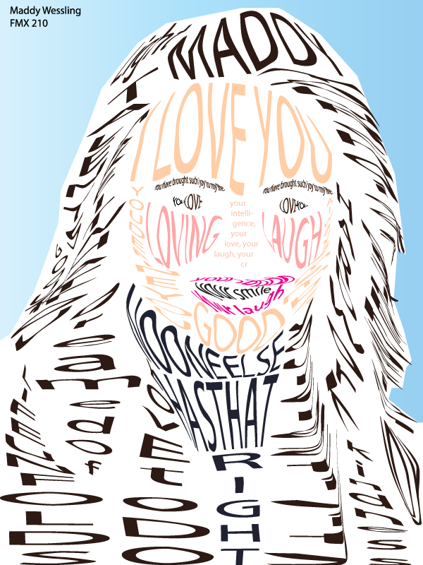 DESCRIPTION: “Calligram” is an image created of myself using only text. The original image was taken in New York by a professional photographer when I was in high school. I then took the text from different notes left to me by my mom and dad. Each word or phrase was chosen about the qualities that my parents admire about me. This project was not the original version, however. After the initial critiques, I went back and redid the entire project after learning and growing from my mistakes.