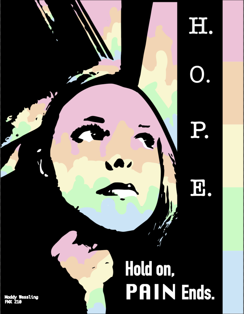 DESCRIPTION: “H.O.P.E.” is a poster created in Adobe Illustrator. I took an image of myself riding the bus and looking out a window from high school. I then turned the image into black and white, making the image have stark contrast. I then took the brush tool and painted in the different rainbow colors around my skin, hair, and parts of the background. Afterwards, I went back in with some white to highlight the lips and the eyes. Then I added the quote around the image which is by Shyla Colt. This piece is one of my favorite pieces I have done while at UT. I have a printed copy in my room to remind me about what I’m passionate about and that bad days won’t last forever.