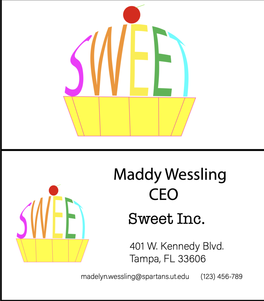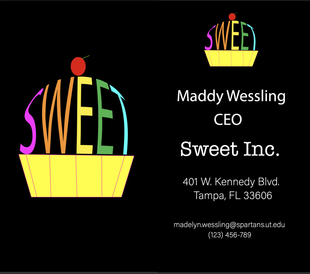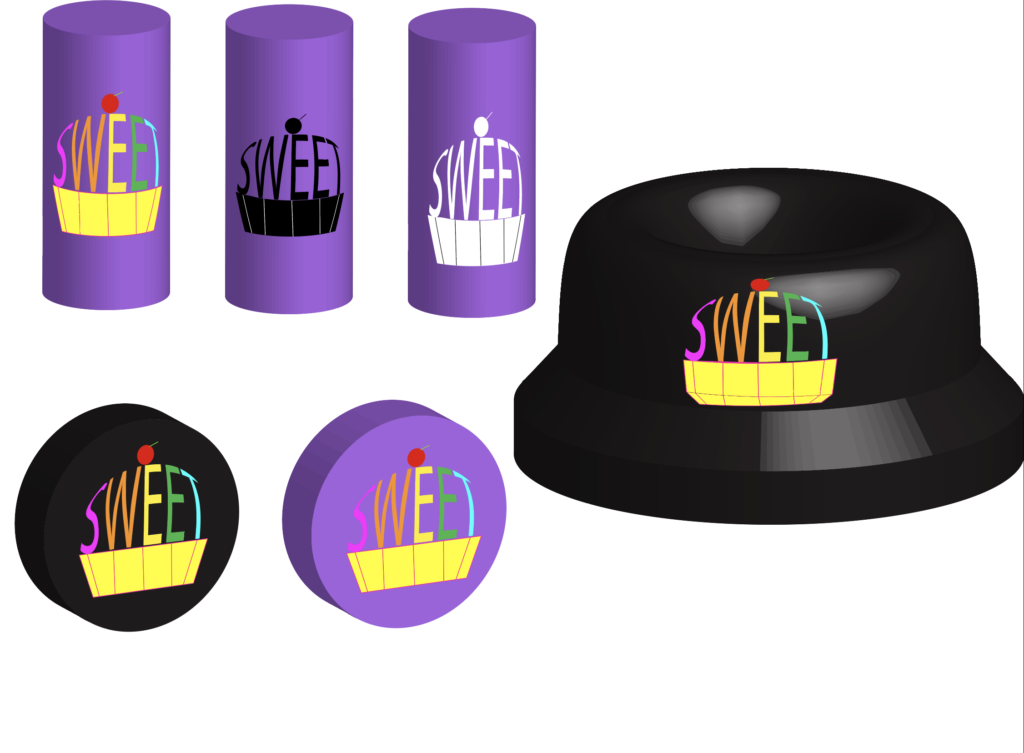 DESCRIPTION: “Business Cards and Logo” are a set of products containing the same logo. First, I created some sketches by hand of what I wanted the design to look like, using different words, colors, and designs. Eventually, I decided I wanted to make a fake company using the word “Sweet,” as I really liked the cupcake design element. I then took the word and created the sketch in Illustrator. Afterwards, I made business cards and merch using different colors and styles. I actually have reused this project and instead of the word “Sweet,” I replaced it with my name. I now use this logo in my email signatures often.