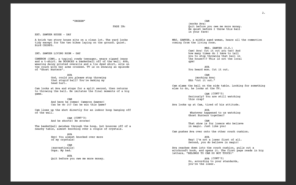 DESCRIPTION: “Unseen” is a short, ten page script. that tells the story of Cam, a teenage boy who doesn’t believe in witchcraft. Cam, Ava (his younger sister), Elijah, and Oliver (Cam’s friends) all discover a dead body in the middle of the woods. Ava believes the body is of a dead witch, but Cam doesn’t think so. Over the course of the story, Cam slowly begins to believe in witchcraft and the group goes back in time to save their town. This script is only the first part of the entire story.