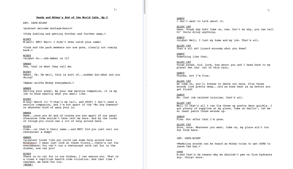 DESCRIPTION: “Sandy and Mikey’s End of the World Cafe and Podcast” is a script for the podcast series of the same name. Both myself and Taylor Hernandez wrote the first three episodes of the series using Final Draft 12. Sandy and Mikey’s tells the story of a post-apocalyptic world where lizards rule the universe. A cat and a dog named Sandy and Mikey run a cafe together even though cats and dogs are not supposed to live together. The series only has the first three episodes at the moment, but there is a possibility for this to continue in the future.